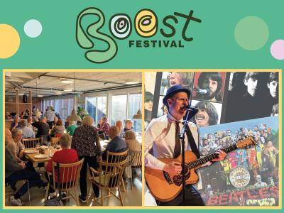 Tag med til fællesspisning og musik med Jens Jepsen (Beatles fortolkninger) i Brohuset. En del af BOOST-festivalen.Fællesområdet i BrohusetGratis -